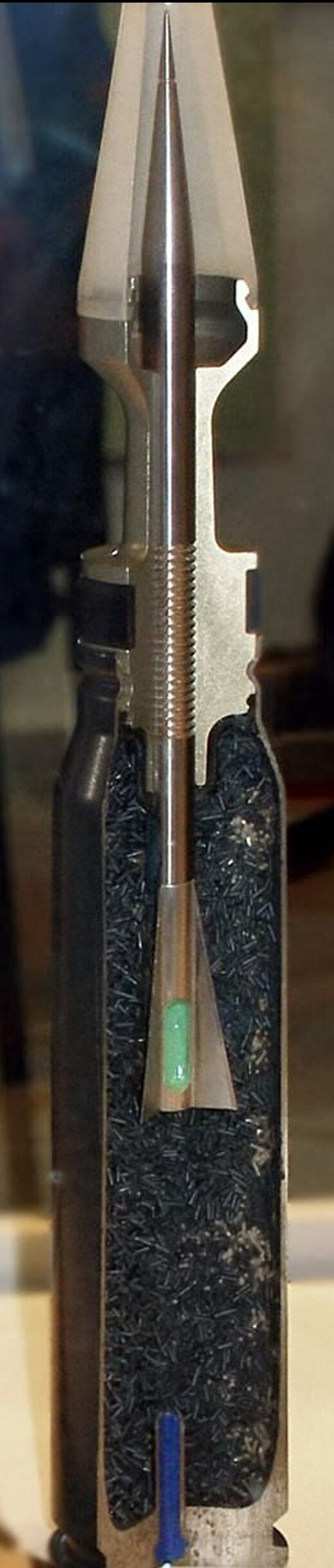 Modern armored vehicles have many lethal threats, from slow-moving Unmanned Aerial Vehicles ( UAVs) dropping munitions to fast anti-tank guided missiles, but the winner of the kinetic energy threat is the kinetic energy penetrator, or KEP. A KEP is typically a rod of a dense material, often tungsten, which is typically fired from an autocannon. The rod is pointed, which assists in penetration, and the metal is often treated to have a “self-sharpening” effect through manipulation of the grain structure in the metal or the use of composites to form layers that are sloughed off. Full penetration of the armor creates shrapnel and heat inside the vehicle, rendering the crew and equipment non-functional, even with very thick armor (the M1 Abrams has up to 700 mm equivalent of rolled homogeneous armor), which a KEP can penetrate. The tungsten rod has tail fins to help it maintain stability in flight and a perpendicular orientation on contact with the target. In the cannon it’s surrounded by a lightweight sabot (French for clog, a type of shoe) that fills the chamber and barrel to take the full pressure of the propellant ignition but separates from the KEP round soon after the assembly leaves the muzzle. A typical KEP has a mass of 6.2 kg and a muzzle velocity of 1,560 m/s, which leads to a muzzle energy of over 15 megajoules. In comparison, a .30-06 rifle round, which is considered ample for big game, has a muzzle energy of only 3.6 kilojoules. Anti-tank rifle rounds on the order of 20 mm caliber achieve about 6 MJ at the muzzle. The figure shows a 30 X 173 mm armor piercing fin stabilized discarding sabot-tracer (APFSDS-T) round that can be used in a 30-mm NATO autocannon. For scale, it’s 290 mm long.